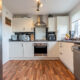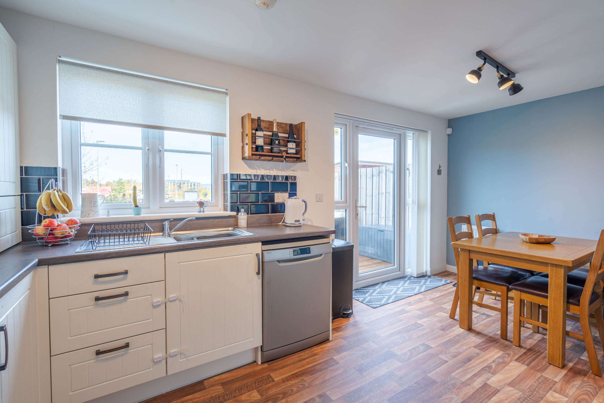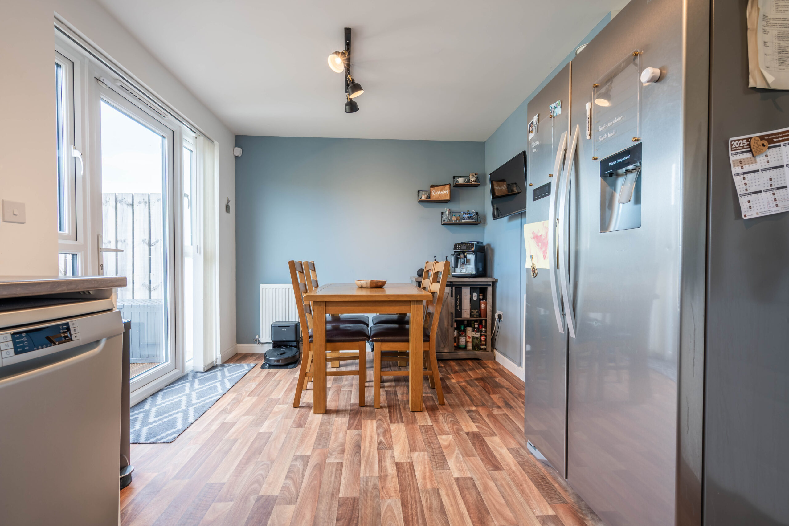 Inside, the accommodation is bright and well laid out. The living room sits to the front, while the modern kitchen and dining area to the rear opens directly onto the garden through patio doors, creating a seamless indoor-outdoor flow. A downstairs WC completes the ground floor.