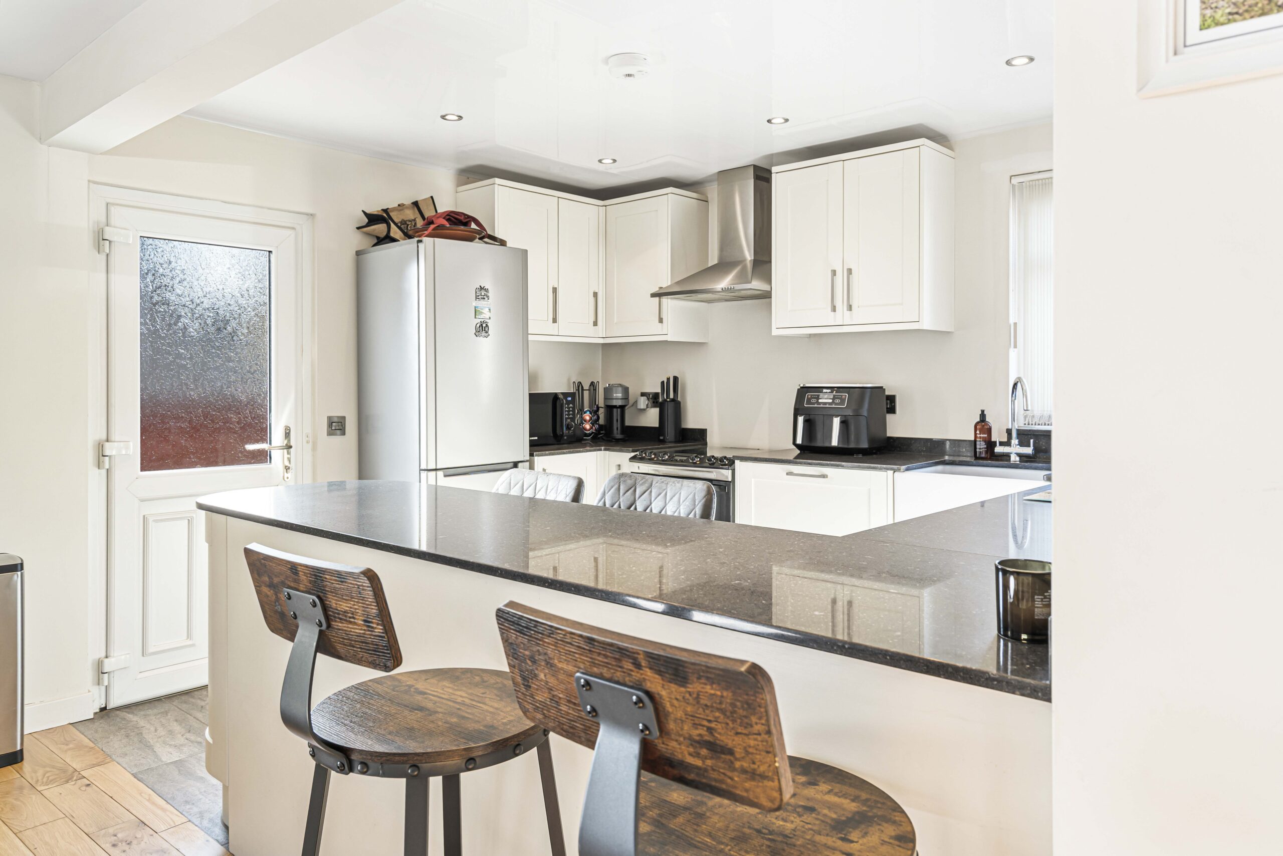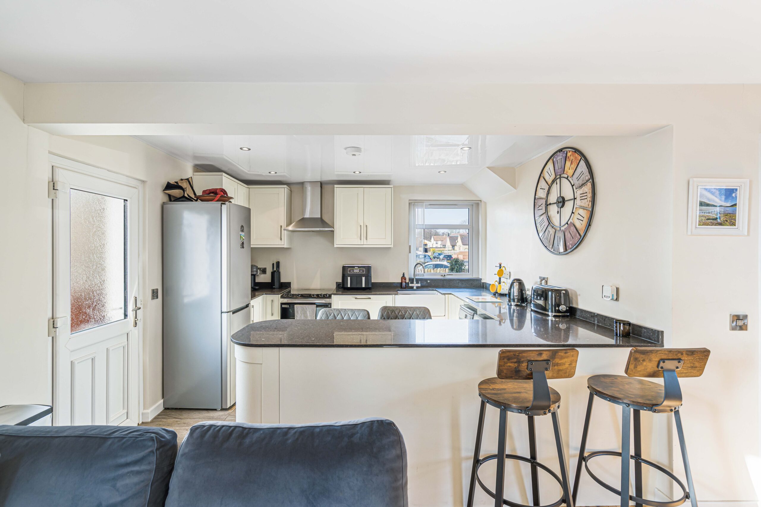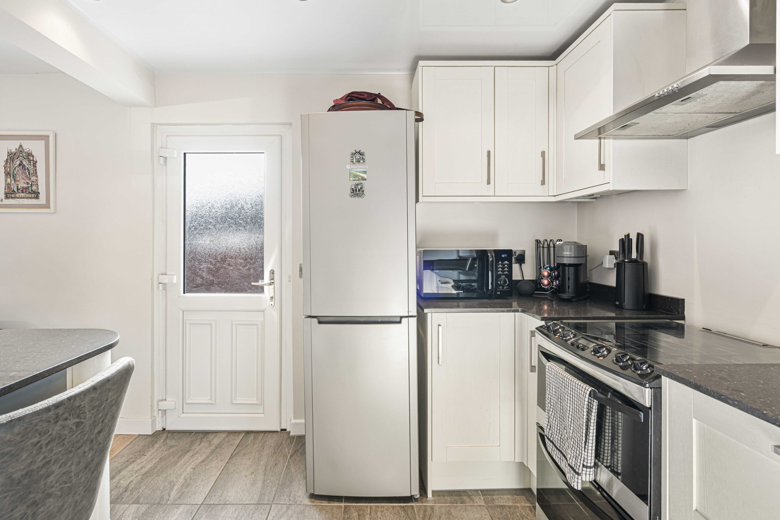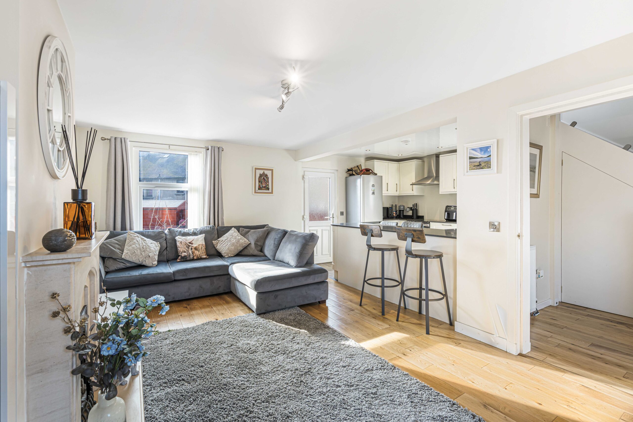 This beautifully presented end-terrace home offers bright, well-proportioned accommodation with an attractive outlook. The ground floor comprises a welcoming entrance hallway with useful storage, and an impressive open-plan living and kitchen area featuring dual-aspect windows that flood the space with natural light. The contemporary kitchen is fitted with stylish base and wall units, complemented by a breakfast bar, and provides direct access to the south-facing rear garden.