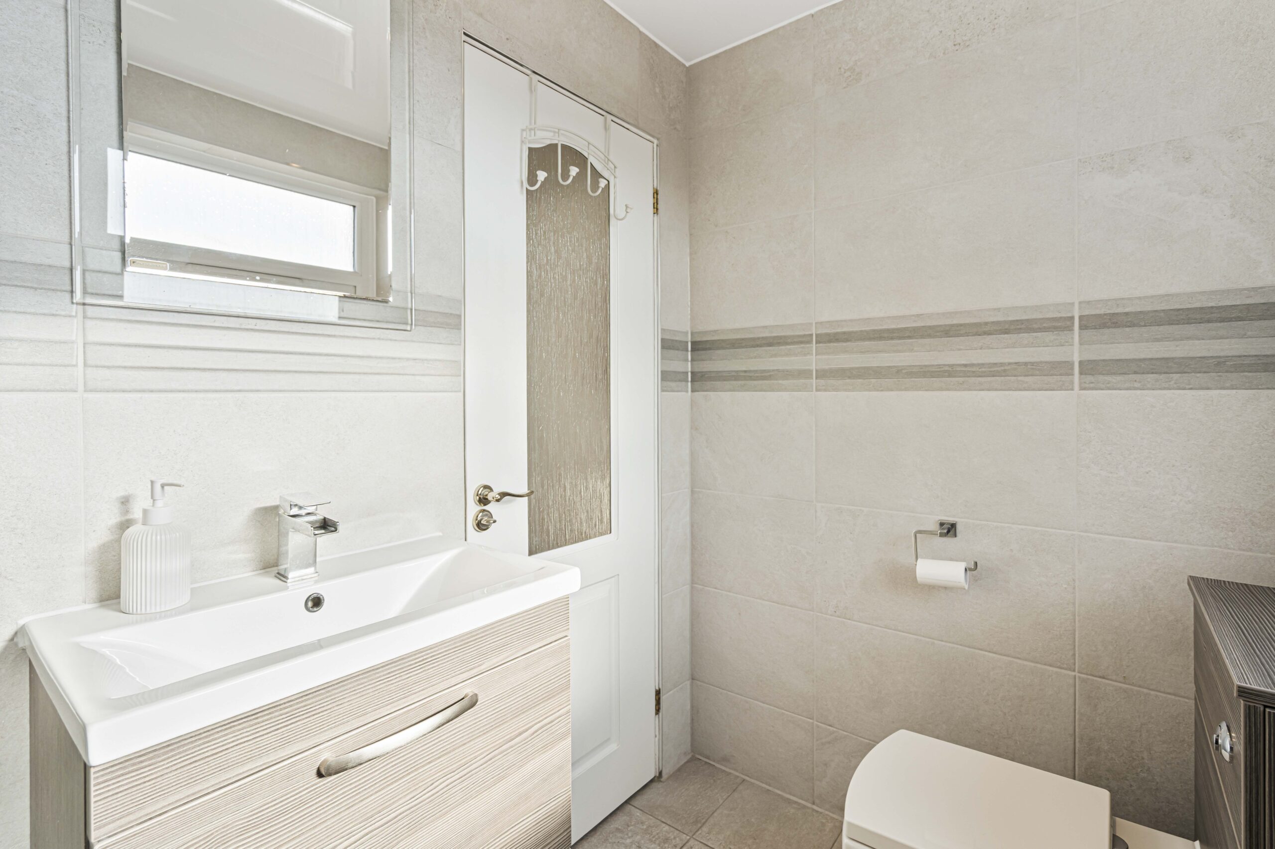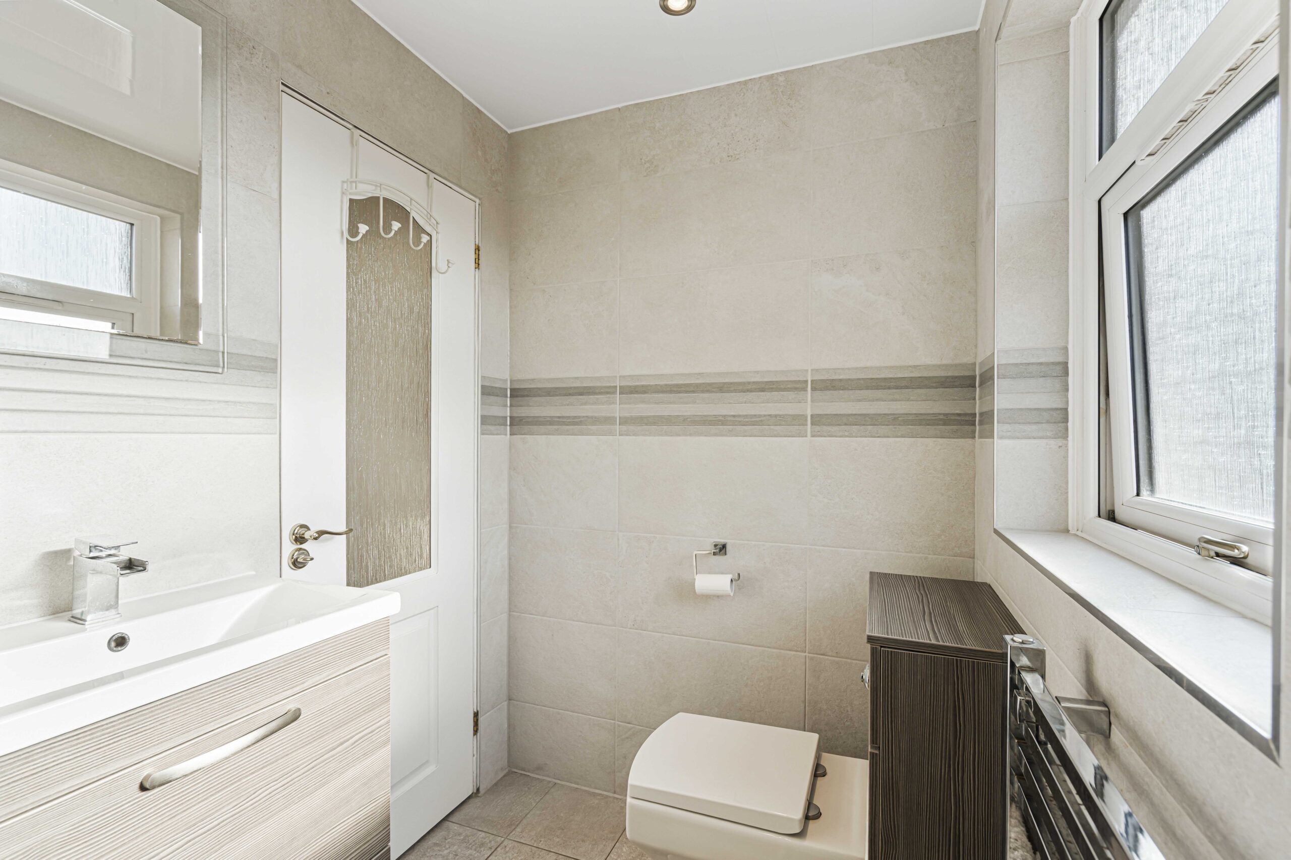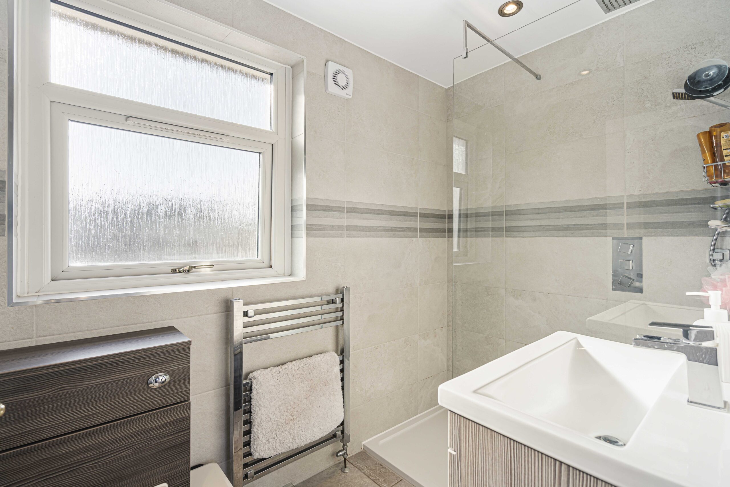 Upstairs, the property offers two well-appointed bedrooms, including a principal bedroom with fitted wardrobes. A sleek and modern bathroom completes the accommodation, featuring a generous walk-in shower, WC, and wash hand basin.