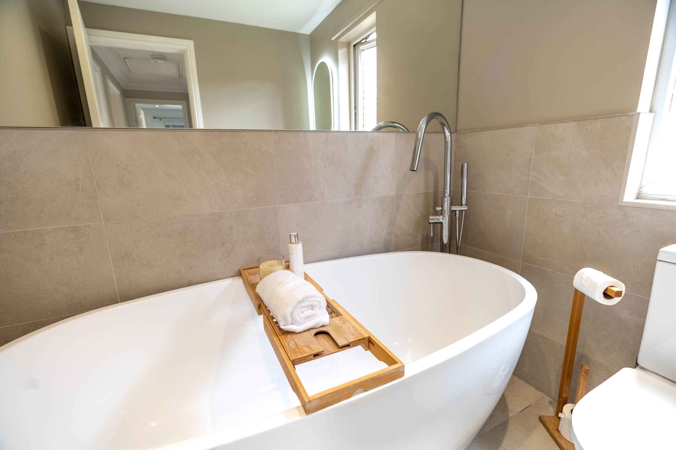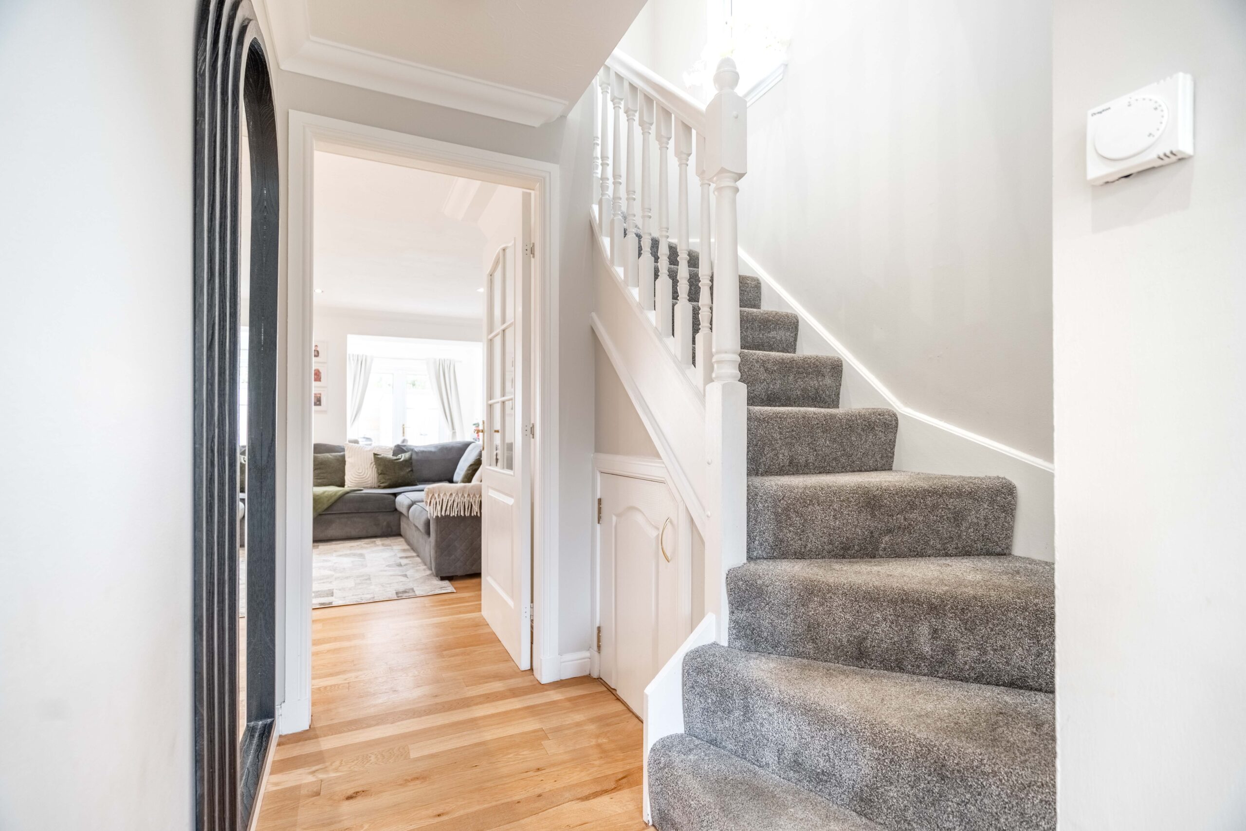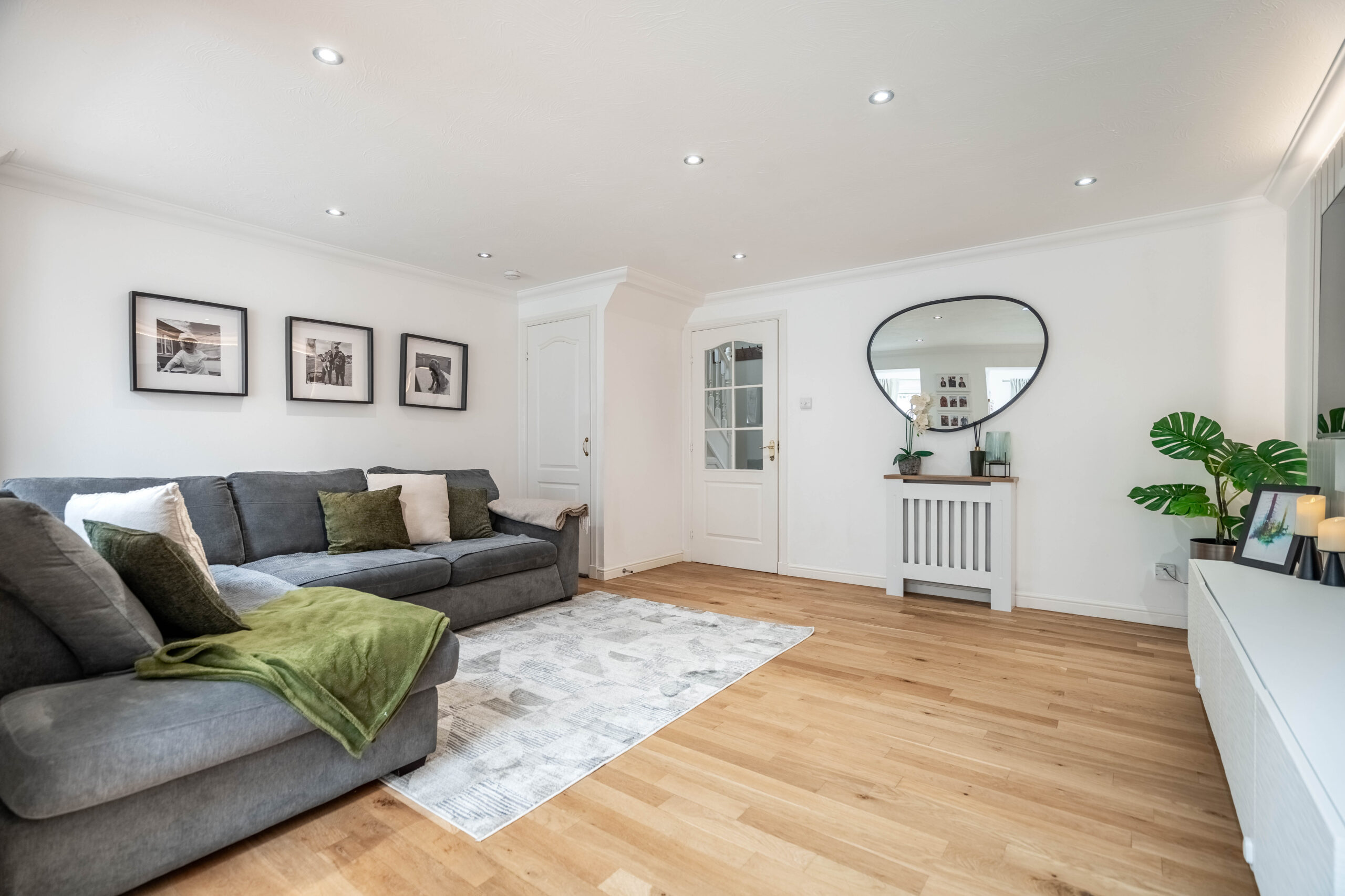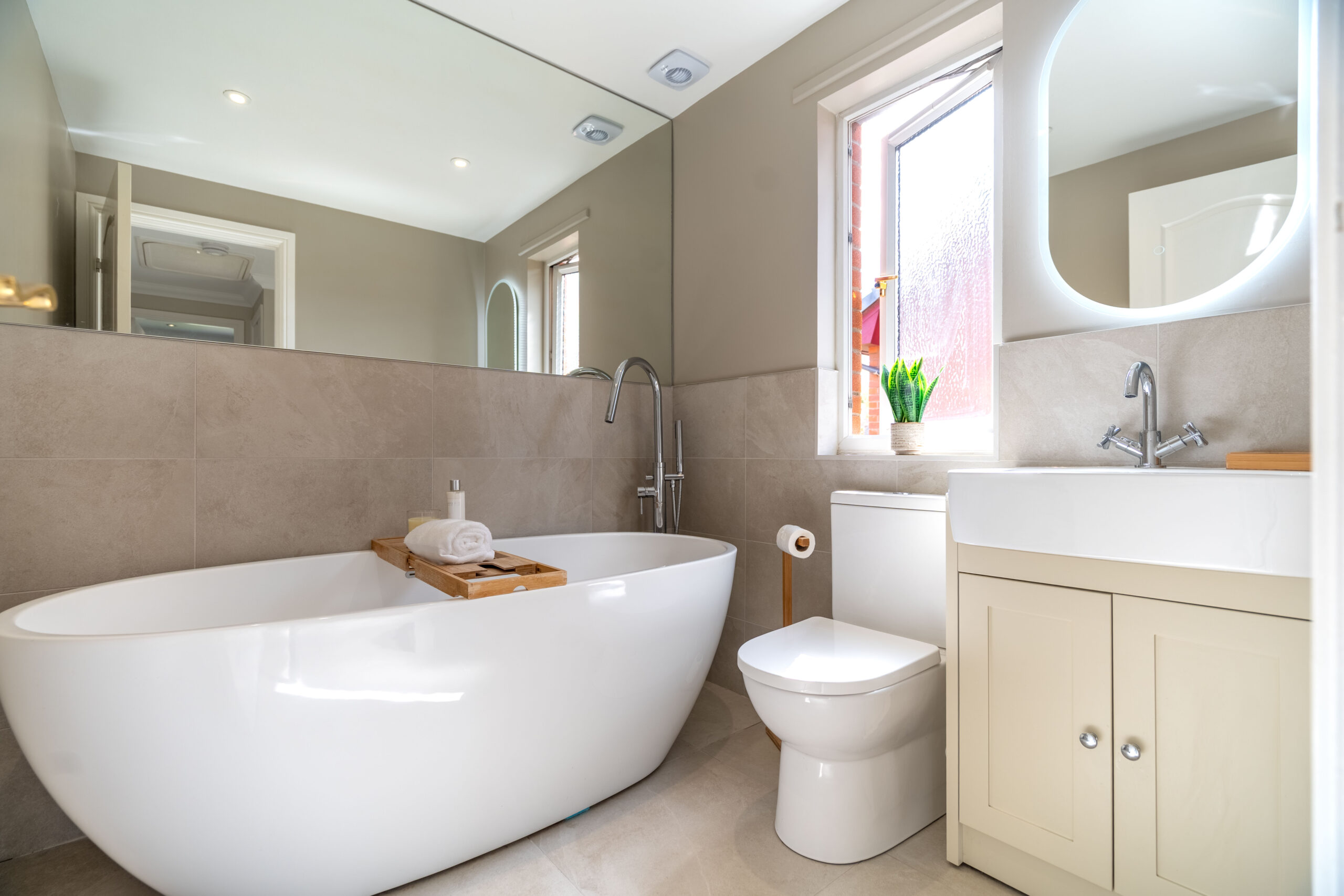 The kitchen is a well-maintained modern IKEA installation, offering practicality and ample storage. Upstairs, there are three well-proportioned bedrooms, including a principal bedroom with a modern en-suite shower room. Bedroom two benefits from a bespoke fitted wardrobe, while the main family bathroom has been recently upgraded with a freestanding bath and floor-mounted tap, creating a luxurious feel.