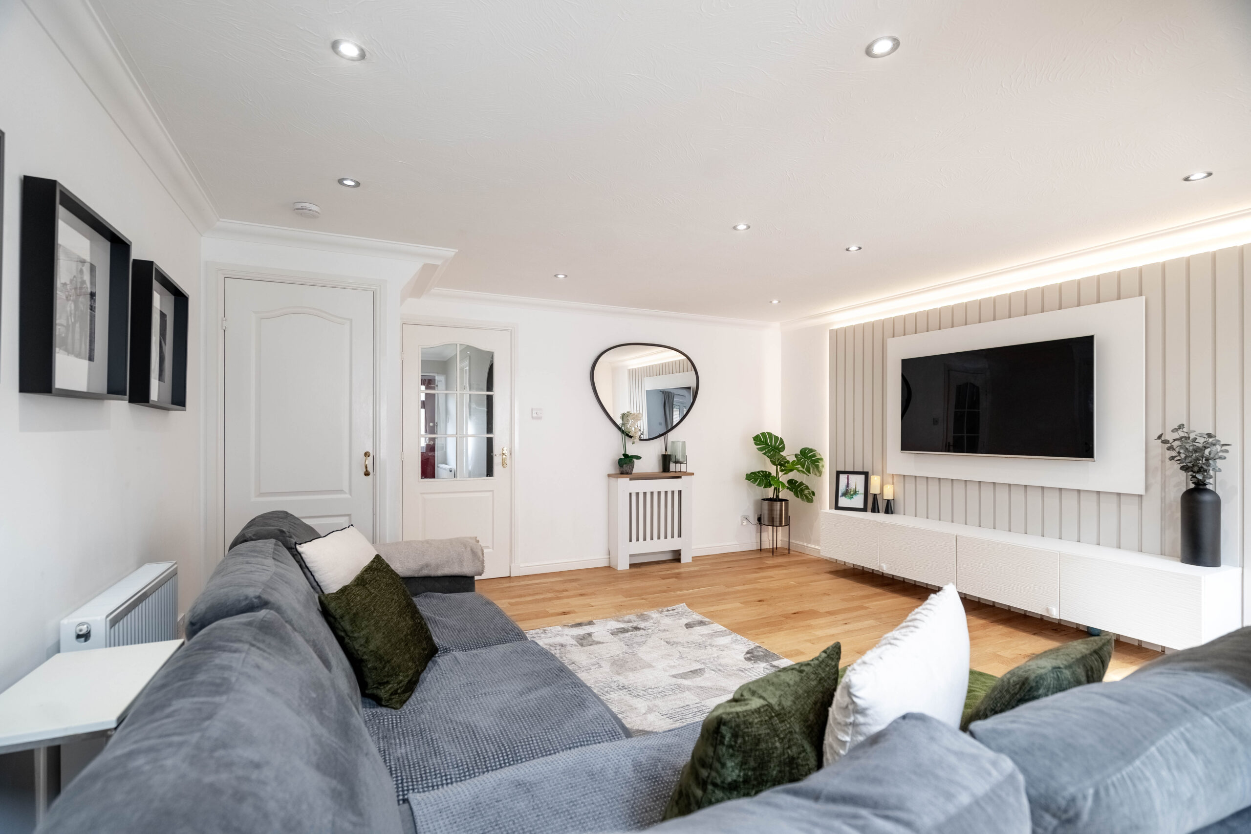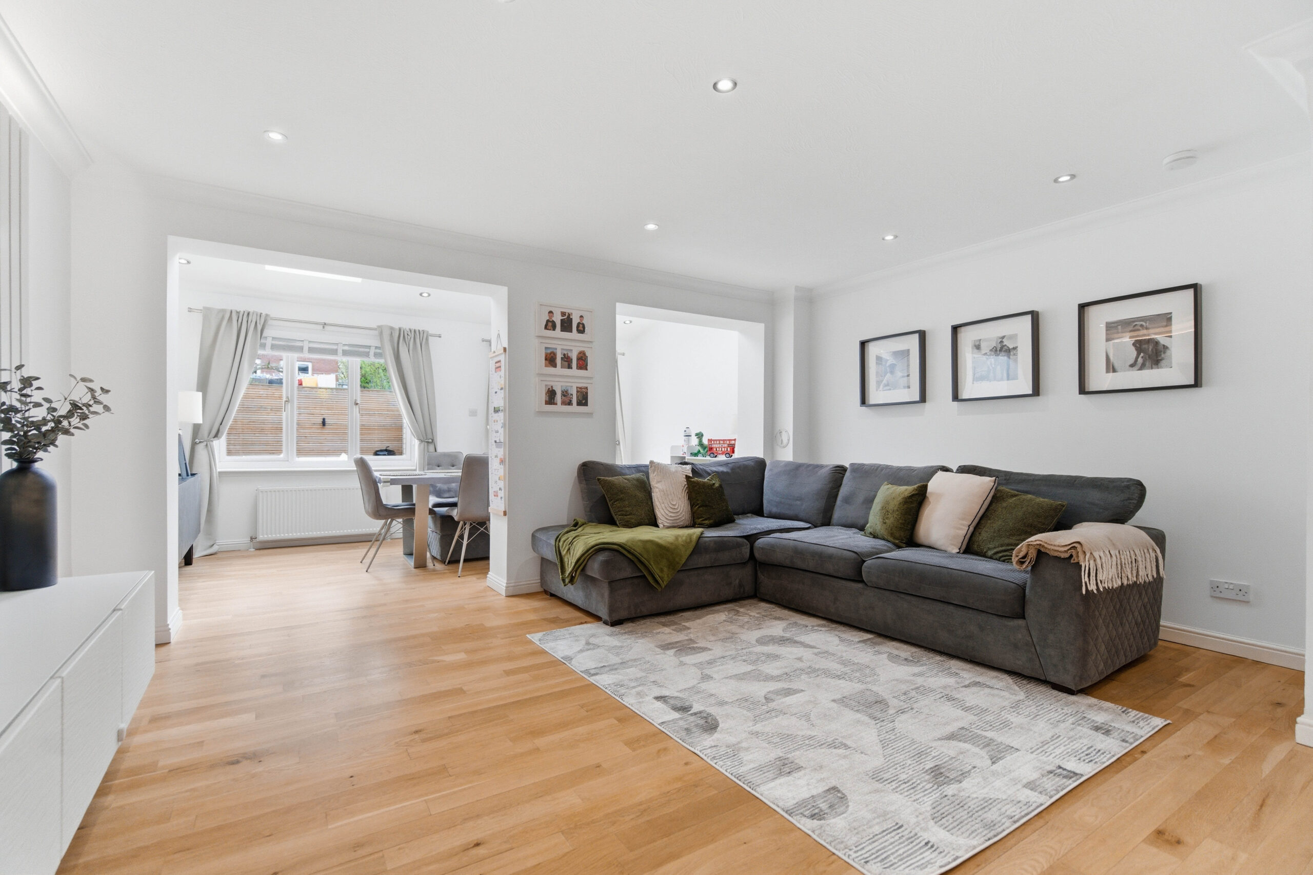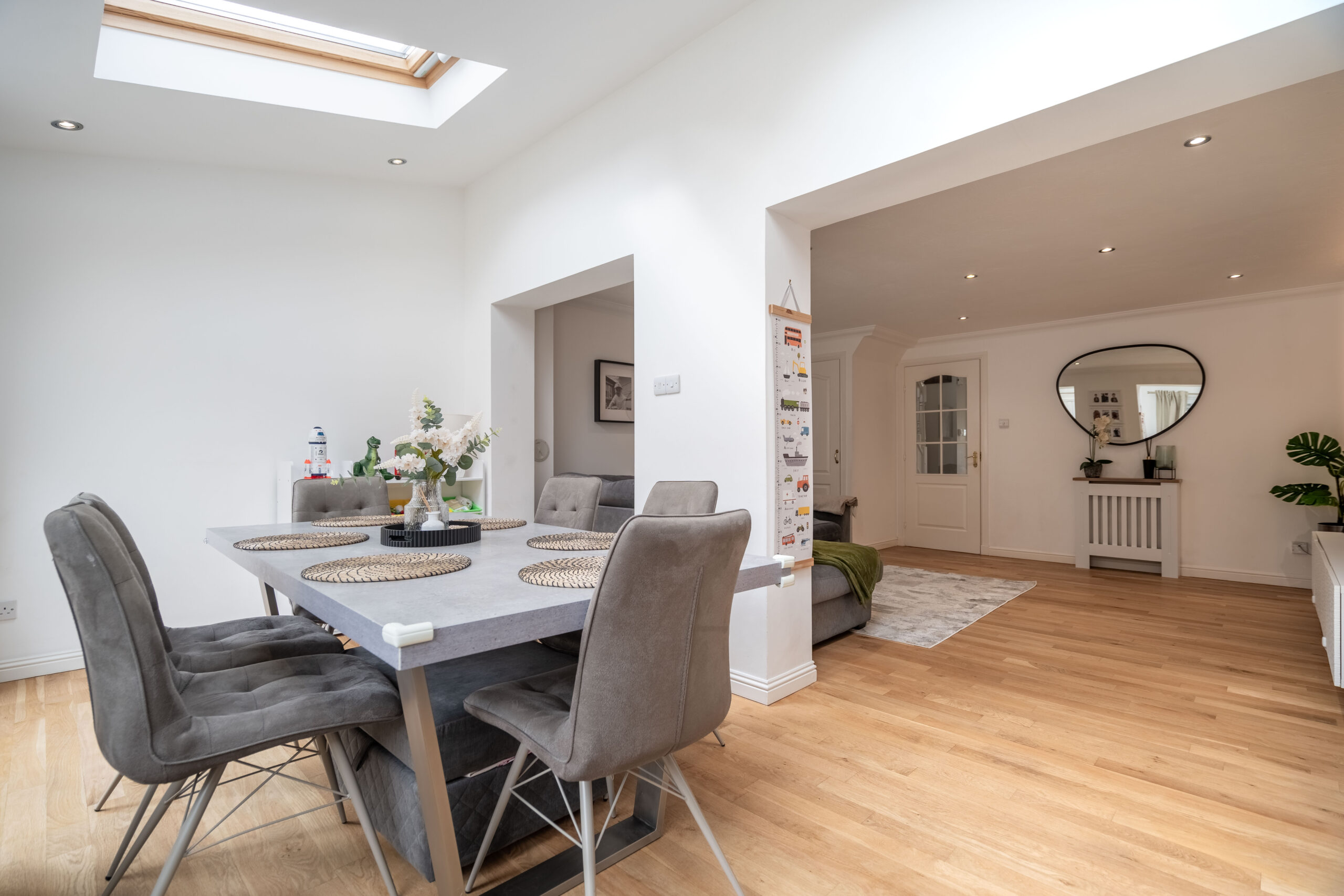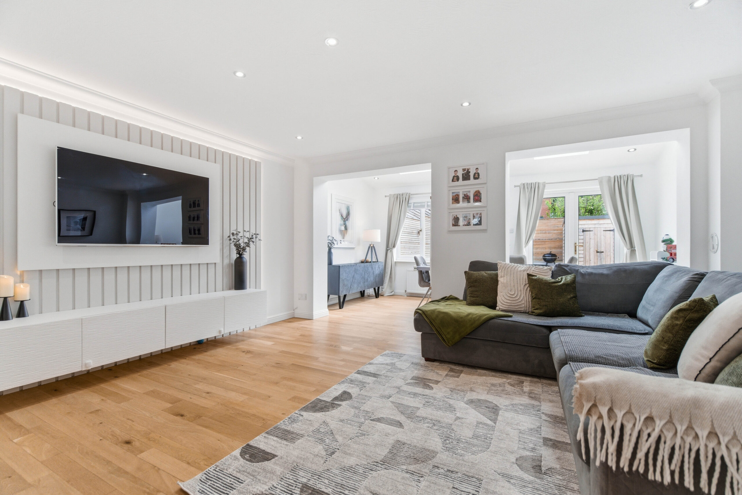 The ground floor features real hardwood flooring throughout (excluding the kitchen), professionally sanded and re-varnished, alongside a contemporary minimalist media wall that enhances the stylish living space. To the rear, a bright extension with two skylights and French doors floods the home with natural light and provides seamless access to the garden, ideal for both relaxing and entertaining.