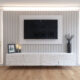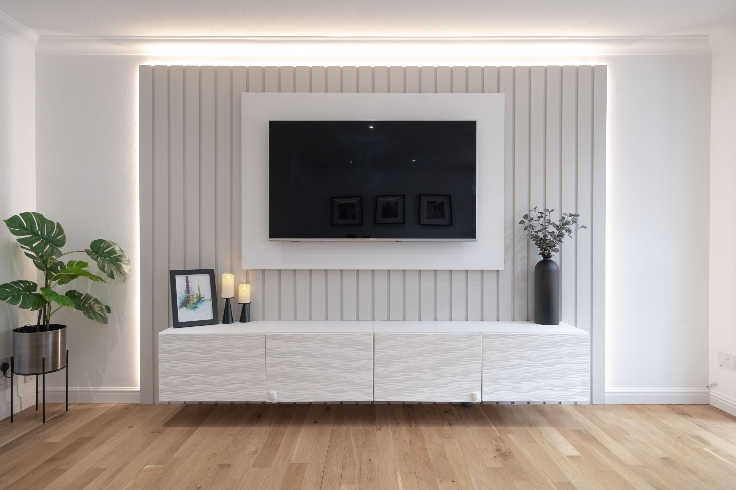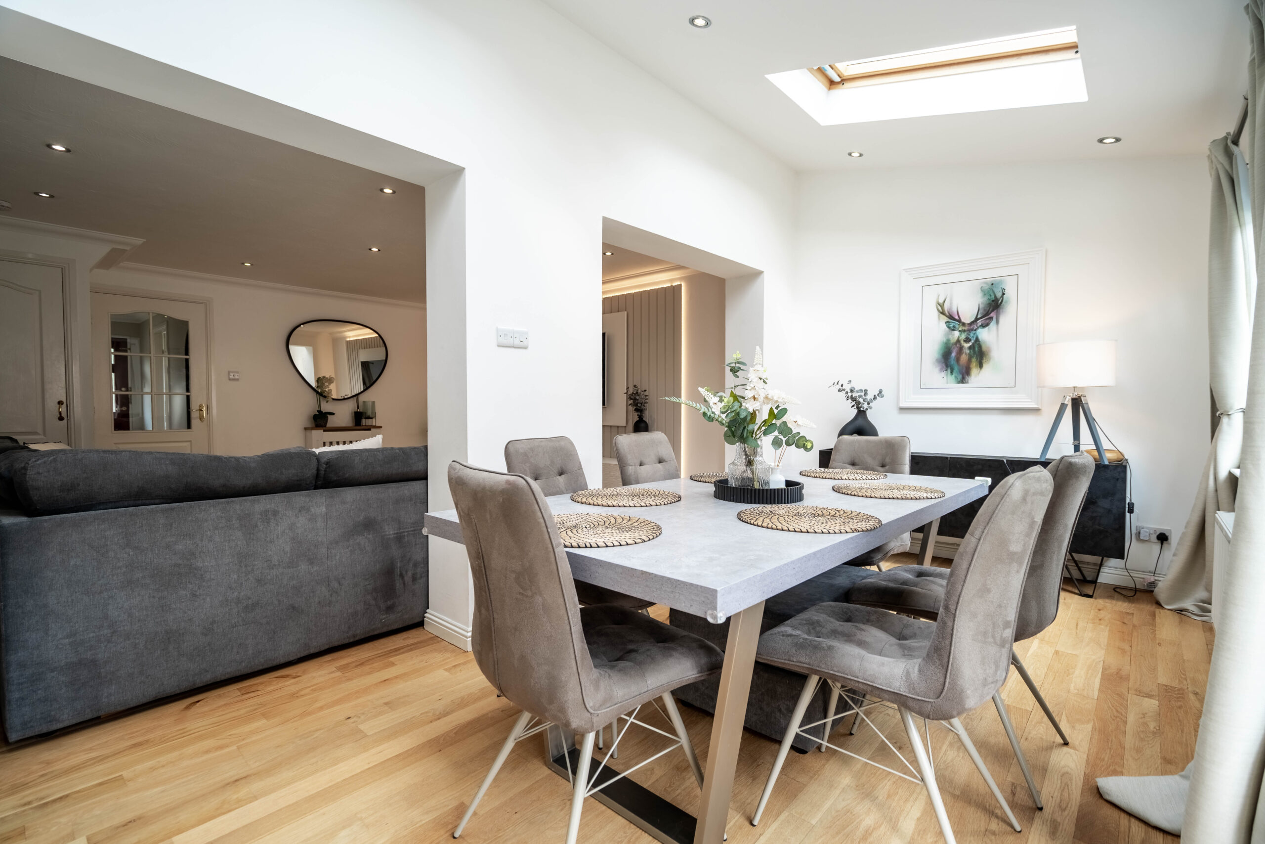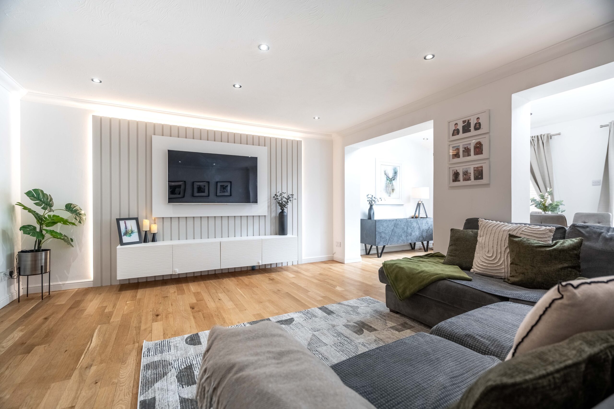 The ground floor features real hardwood flooring throughout (excluding the kitchen), professionally sanded and re-varnished, alongside a contemporary minimalist media wall that enhances the stylish living space. To the rear, a bright extension with two skylights and French doors floods the home with natural light and provides seamless access to the garden, ideal for both relaxing and entertaining.
