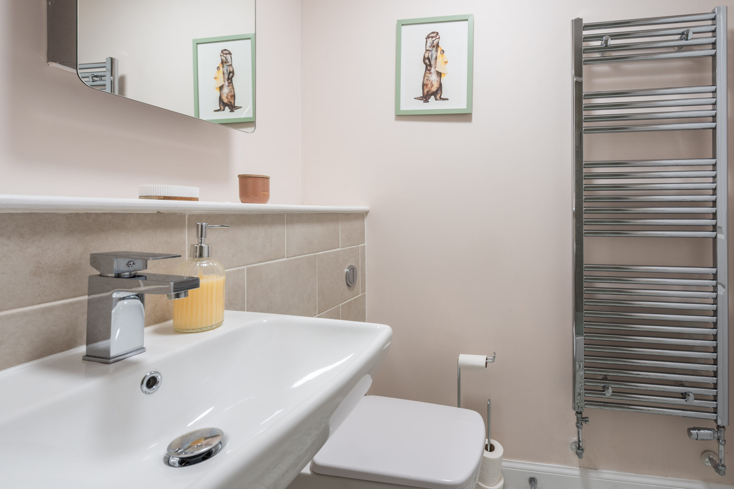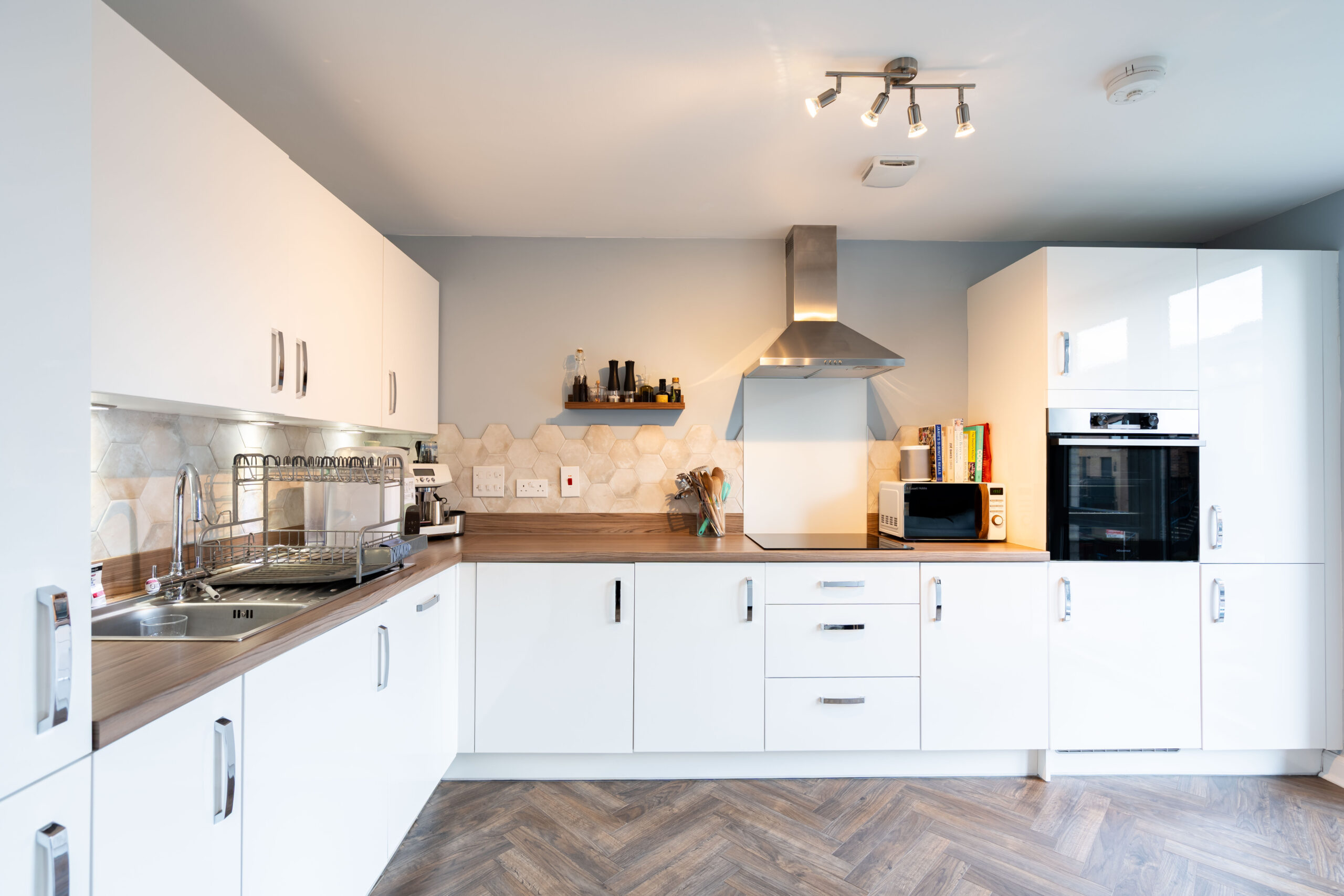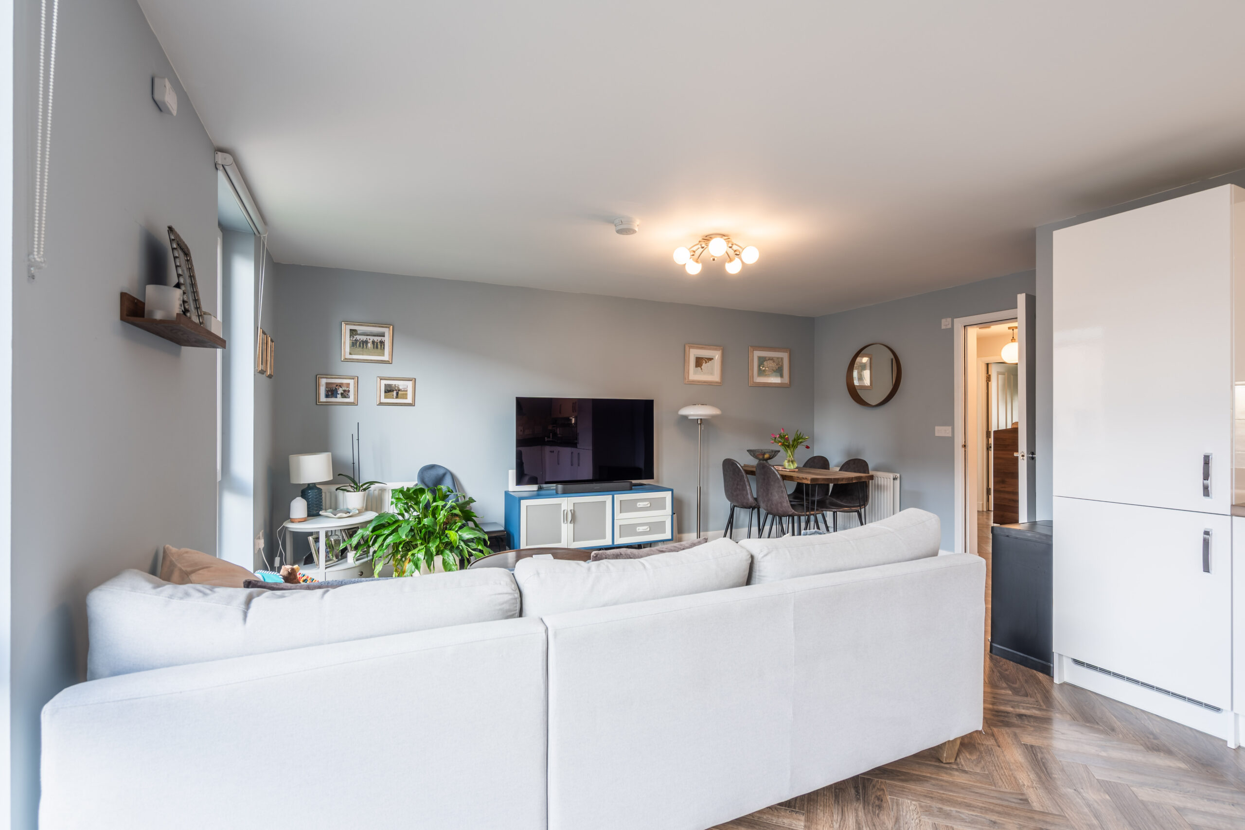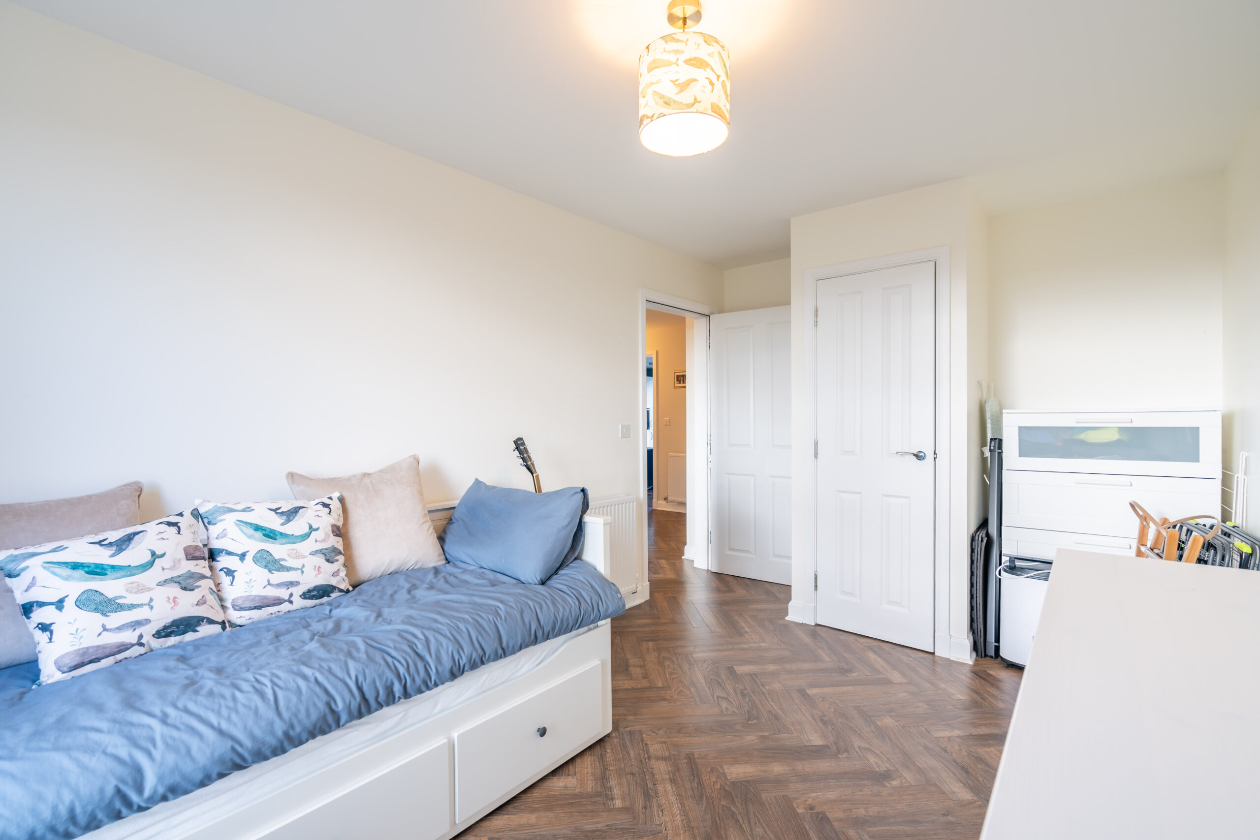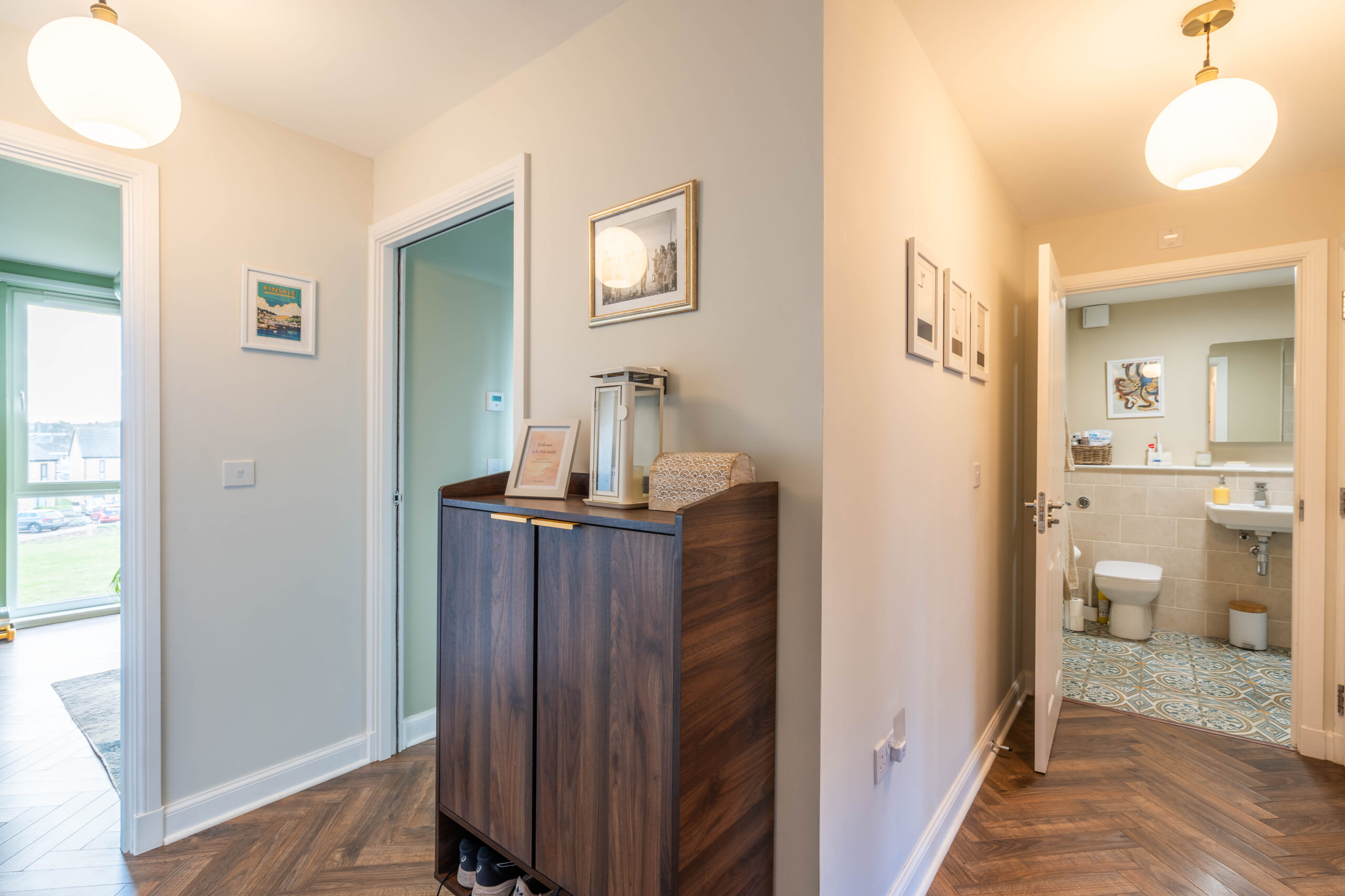 The property boasts three generously sized bedrooms, including a principal bedroom with a modern ensuite shower room. The remaining two bedrooms are equally well-proportioned, and all three bedrooms have access to a main bathroom which is immaculate in condition. The home further benefits from a contemporary finish throughout and a separate utility cupboard providing dedicated space for a washing machine, helping to keep the main living areas clutter-free.