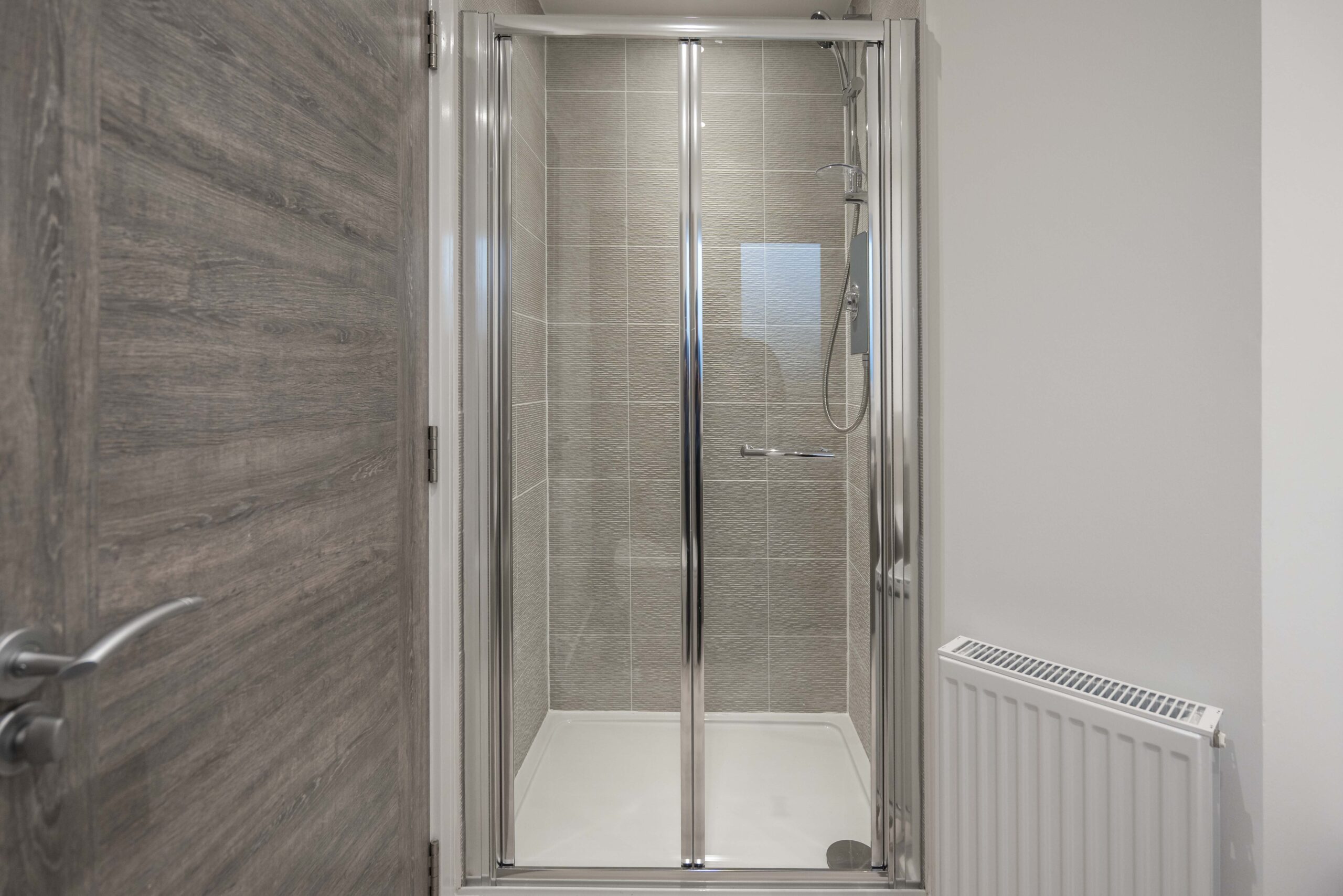 The contemporary kitchen is a standout, featuring integrated appliances, stylish composite sink with upgraded tap, and a choice of modern finishes. A separate utility room enhances functionality, while the spacious lounge includes TV/FM/SAT and BT points for future connectivity. Bathrooms and en-suites are finished to an exceptional standard with sleek white sanitaryware, Porcelanosa tiling, semi-frameless shower enclosures, and thermostatic showers for added luxury.